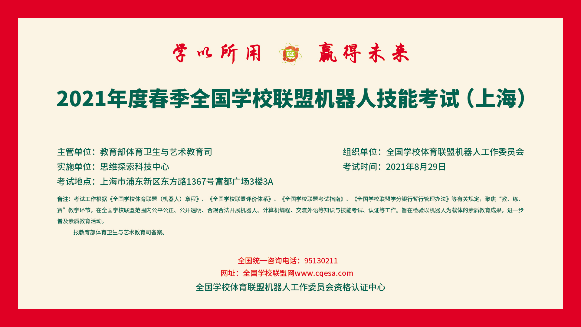 2021年度春季全国学校联盟机器人技能考试(上海)公告